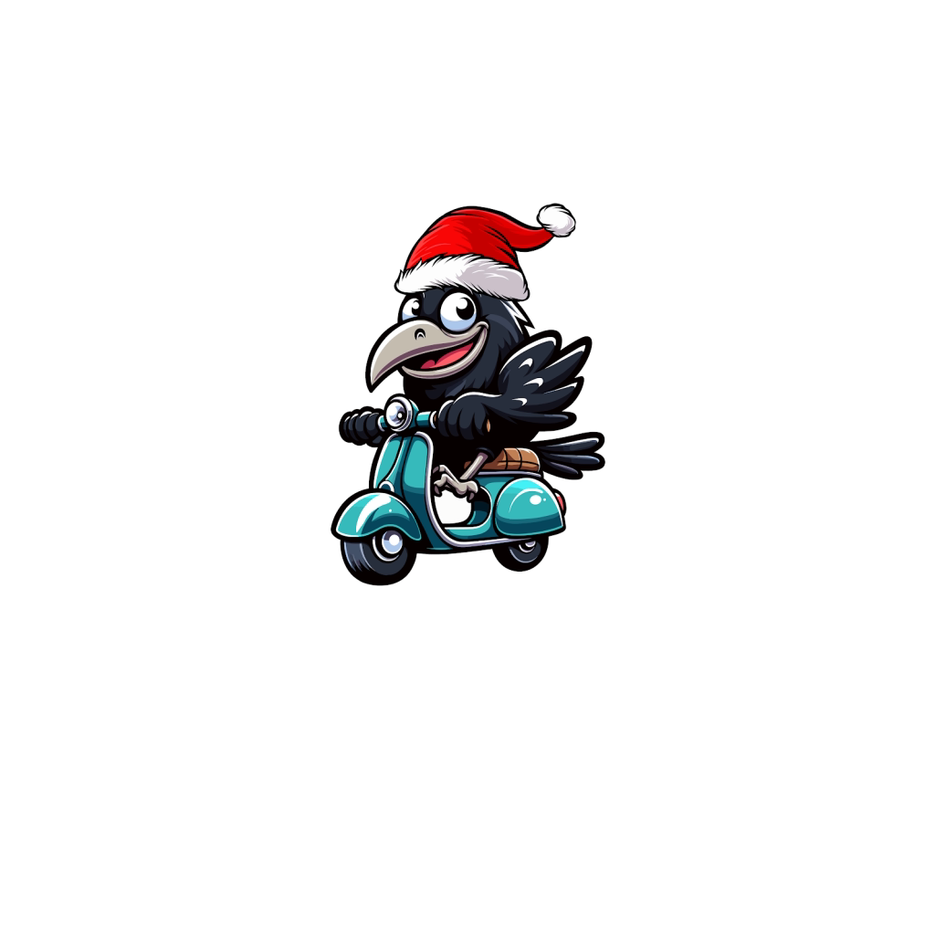 adorable Crow Riding Scooter wearing santa hat 2