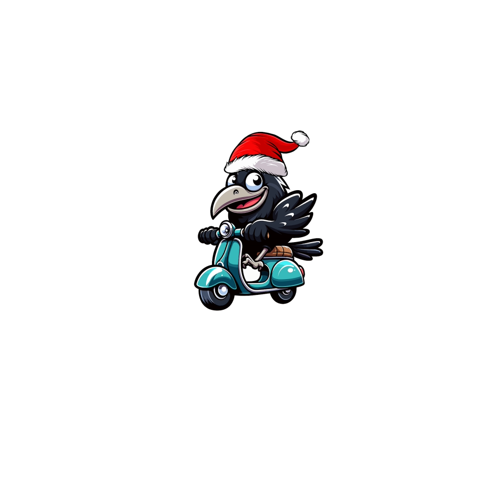 adorable Crow Riding Scooter wearing santa hat 2