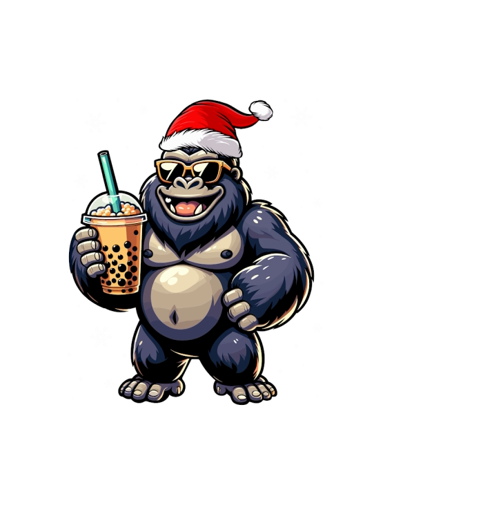adorable gorilla drinking boba tea wearing santa hat 1