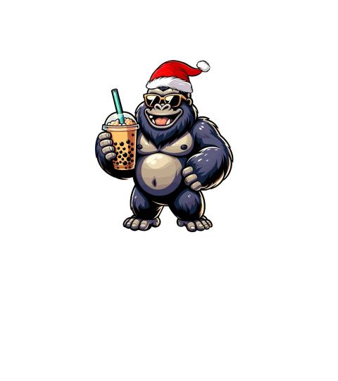 adorable gorilla drinking boba tea wearing santa hat 1