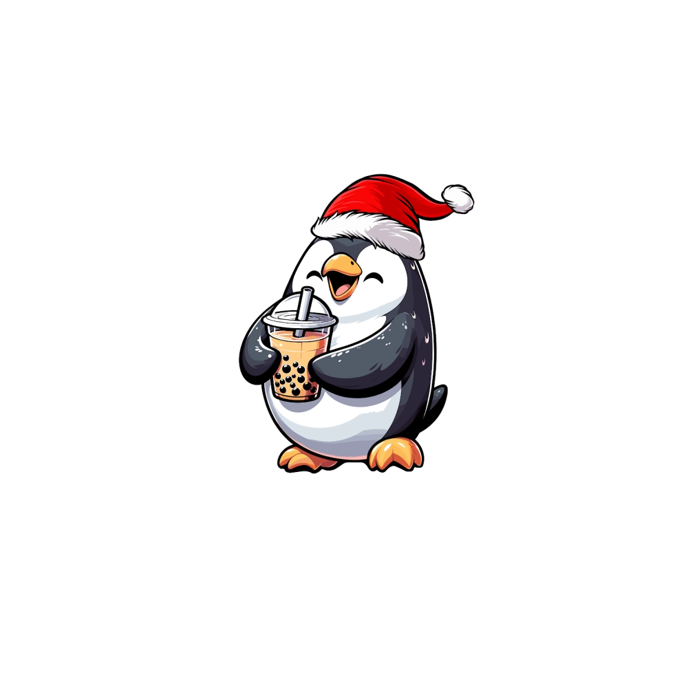 adorable penguin drinking boba tea wearing santa hat 1