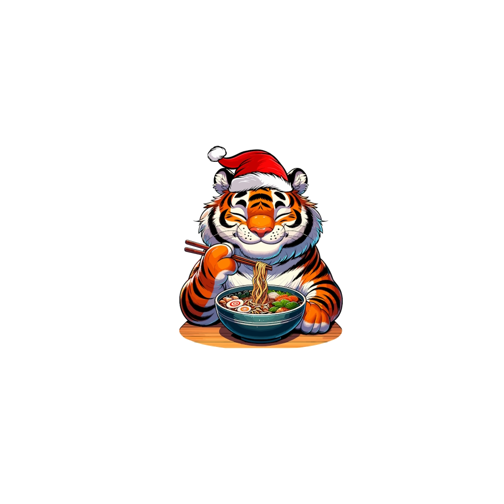 adorable tiger eating ramen wearing santa hat 1