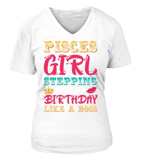 Shop Pisces Girl Stepping Into My Birthday Like A Boss V-neck T-Shirt Woman custom made just for you. Available on many styles, sizes, and colors.