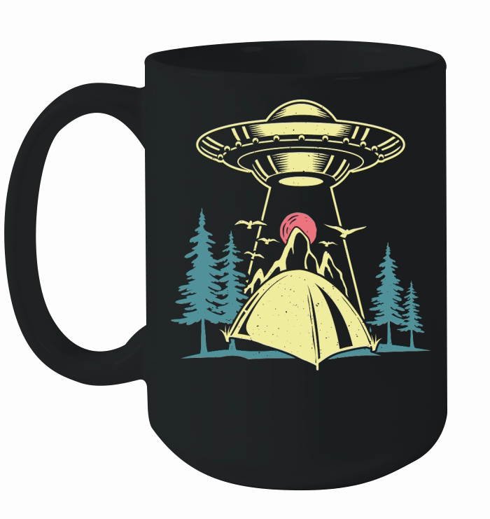 Shop Vintage UFO Alien camping mountain Ceramic Mug custom made just for you. Available on many styles, sizes, and colors.