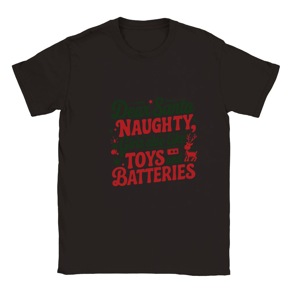 Shop Dear santa naughty girls also like toys and batteries Classic Kids Crewneck T-shirt custom made just for you. Available on many styles, sizes, and colors.