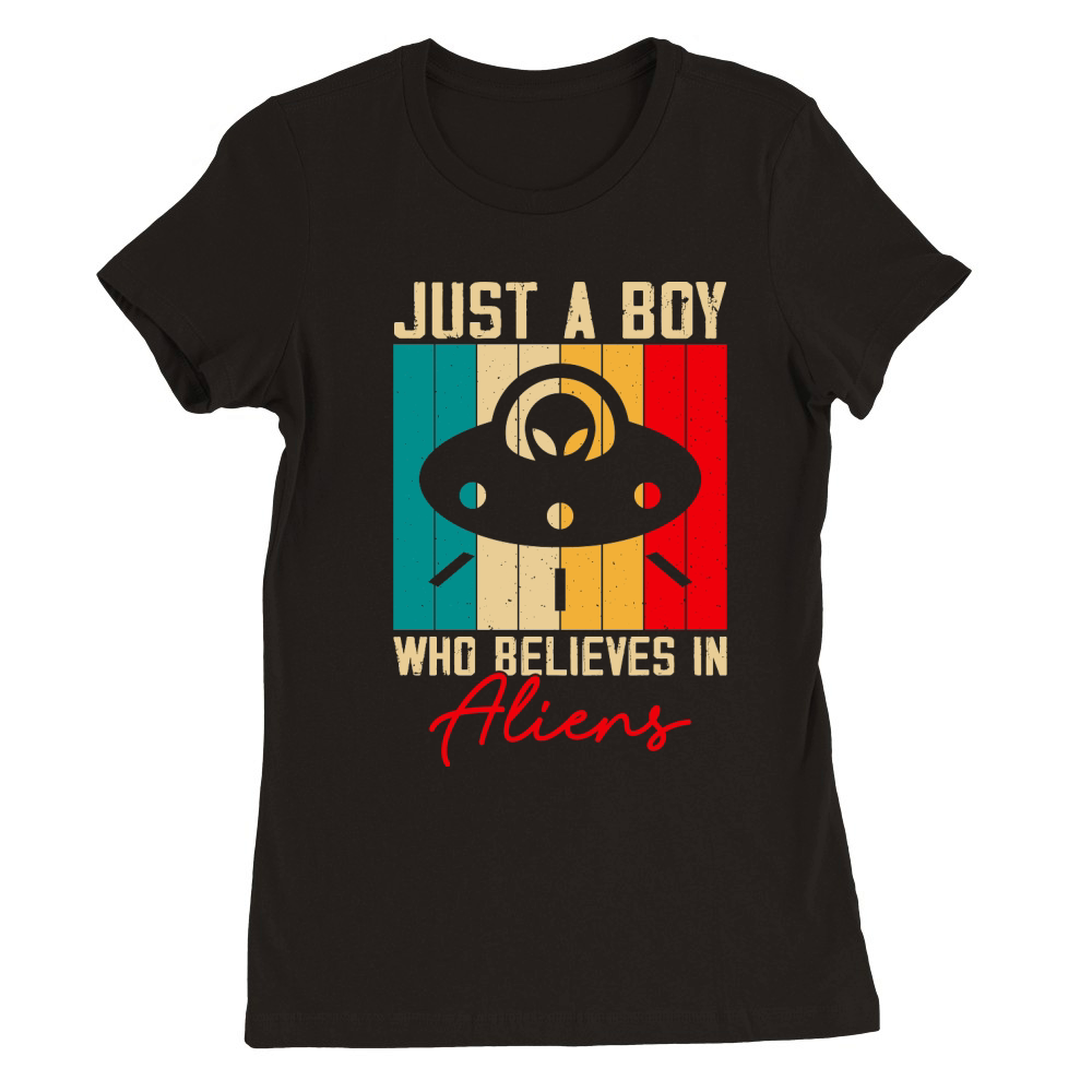 Shop Vintage UFO Alien just a boy who believes in Aliens 2 Premium Womens Crewneck T-shirt custom made just for you. Available on many styles, sizes, and colors.