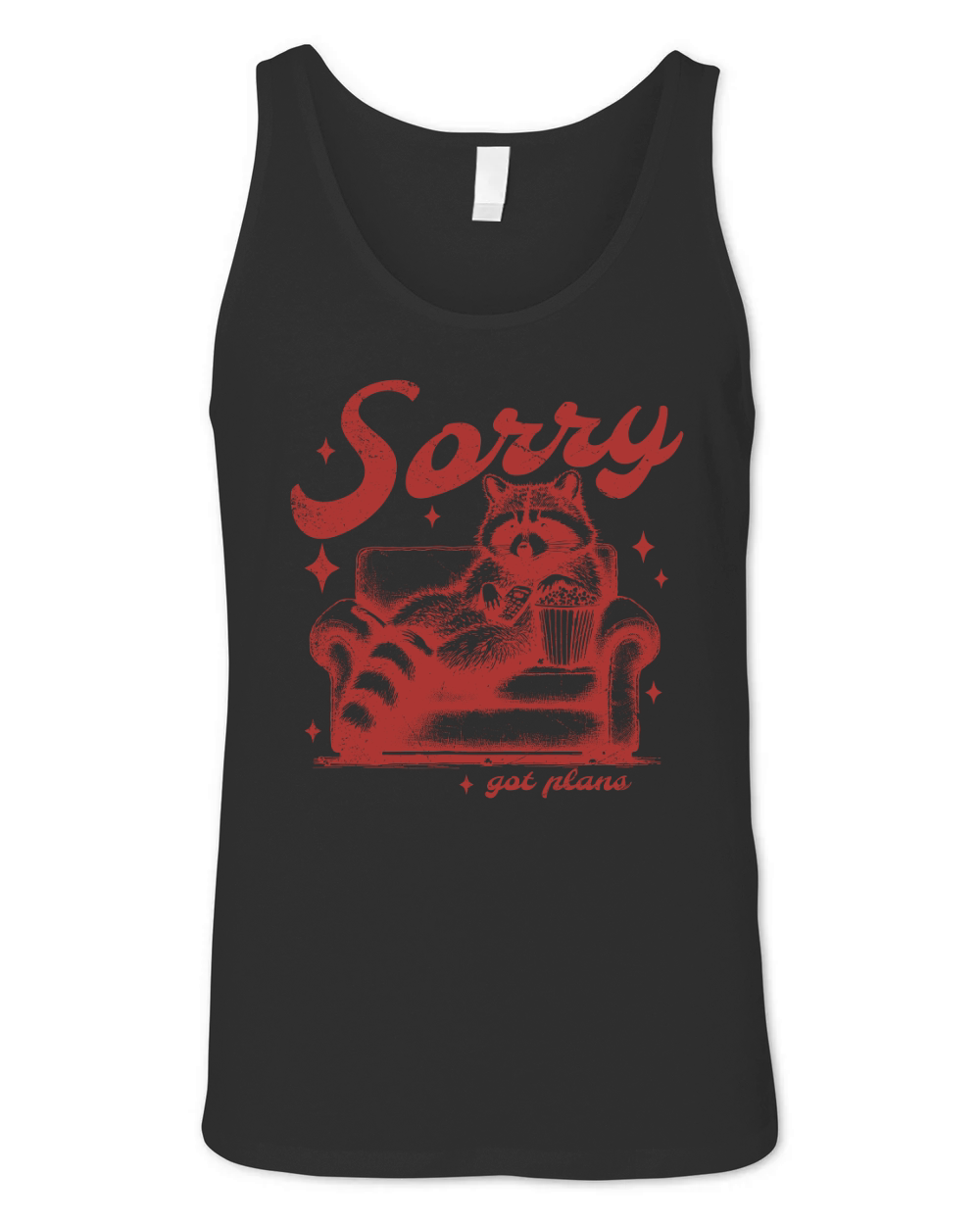Shop Sorry Got Plans Raccoon Sofa Popcorn D Red GR Unisex Jersey Tank custom made just for you. Available on many styles, sizes, and colors.