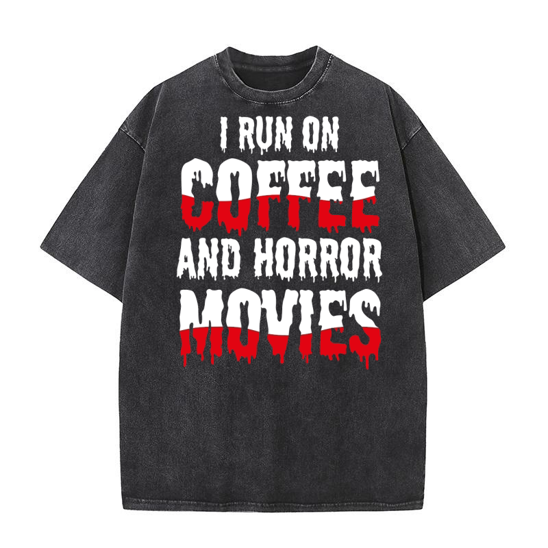 Shop I run on coffef and horror movies Washed T-Shirt custom made just for you. Available on many styles, sizes, and colors.