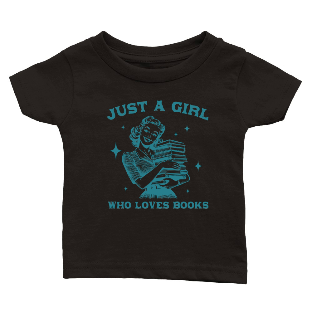 Shop Just A Girl Who Loves Books L Green Classic Baby Crewneck T-shirt custom made just for you. Available on many styles, sizes, and colors.