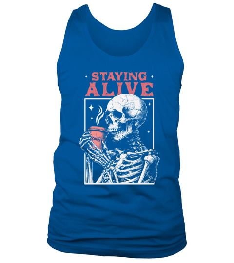 Shop Staying Alive Skeleton Coffee D Color Tank Top Unisex custom made just for you. Available on many styles, sizes, and colors.